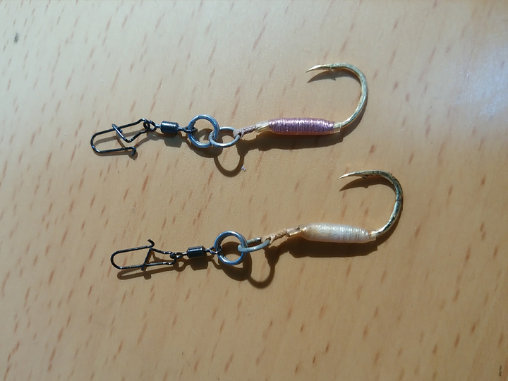 一般的に何処のフィールドでも無難に使用できるのが「アミエビ」です。例えばコマセ釣りの船に同船してジグでマダイを狙う時でも明らかに他人より釣果を上げることができました。また、これからのシーズンでシラスを捕食し始めて中層付近に浮いている状況の時は「近海シラス」を使用いています。フックセッティングは写真の様にセットし使用しています。