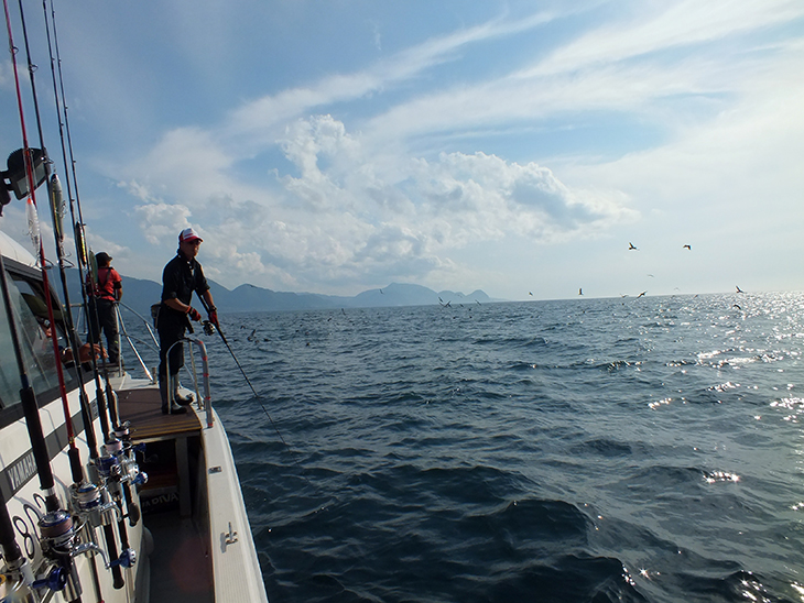 白石礁に到着すると、早くも怪しく動く多くの鳥が見られ、全員ハイテンション! 丹後の場合、時合いは午後からというのが定説のため、午前はウォーミングアップ的な釣りになることが多いです。瀬の上周辺から鳥の動きを注視して、各自ダイビングペンシル(13~18cm)で誘い出しを開始。全員のルアーサイズが違う場合、バイトがあった仲間のサイズで、ある程度ベイトサイズが想定できます。イカや小魚などベイトがコロコロと変わるこのフィールドでは、いち早くベイトの種類を掴まなくてはいけません。