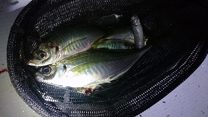 「肝心のアジは何処にいる?」と思いながらレンジを刻んでいくと、ボトム付近を回遊しているようでした。比較的近い堤防の基礎との境付近に多く居るので、2gのジグヘッド単体を投入。ボトムを取った後に少々大きめにリフトをして、リグに追尾するフォールにヒットさせるという感じでした。