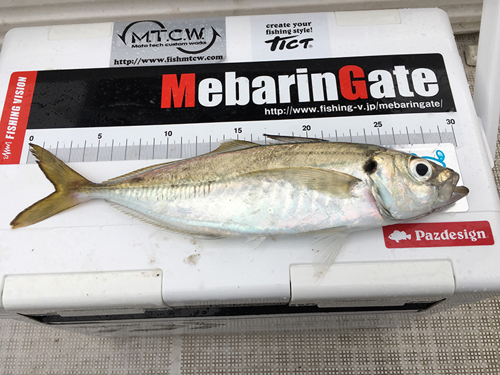 すると、アクション後のステイでコツンと小さなバイトあり、ヒット。エステルラインなのでドラグはやや緩めで慎重にやり取りすると釣れてきたのがいきなりの尺アジ。