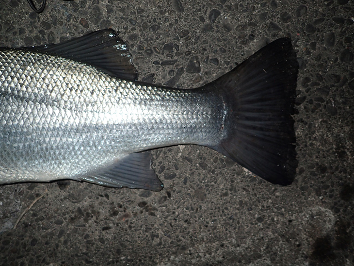 ランディングネットがないのを不安がる相棒に、「大丈夫、いつものようにフィッシュグリップでランディングするから♪」と声をかける。相棒もグレやシーバスにジギングも得意としているのでロッドワークはうまい。足元に寄ってからはロッドを立てさせラインを擦られないようにライトで魚影を照らしながらサポート。