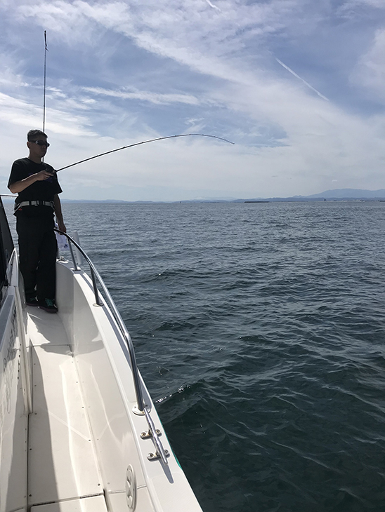 M君は普段磯ロック釣行を楽しむ陸っぱりアングラー。普段の足場と違うボートロックの楽しみを共有したくて誘い出しました。今年の夏は、仙台湾は20m超の深場で良型のクロソイが安定して釣れています。また、良型のヒラメも混じり、時には大型の真鯛も釣れてしまうという夏ロックとしては面白い展開になりました。同時に近くの漁場には、餌でのヒラメ釣り遊漁船も連日出船しており、仙台湾はヒラメが好調のようです。