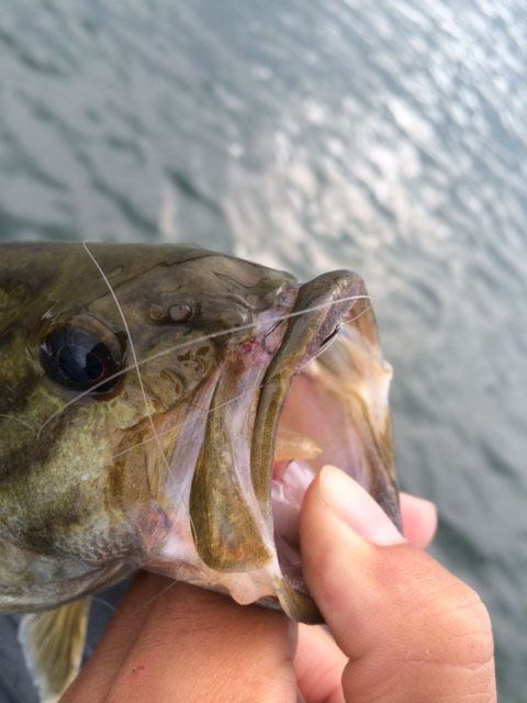 写真のように唇に深くフッキングすると、シャンクが唇(歯)に当たってホールドされた状態になり、口に刺さったフックに遊びがなくなりズレないため、バレることはまずありません。