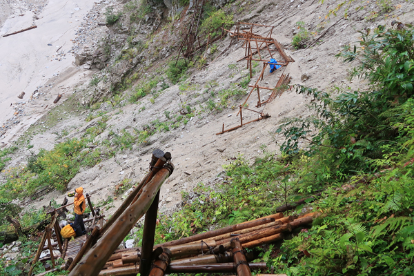 昨日までのエメラルドグリーンの清流は見る影もなく(笑)、魚たちも岩陰でじーっと動かずに耐えているのでしょうか…。前日に通ってきたアップダウンの激しい丸太の足場が、濡れて非常に滑りやすくなっているので、慎重に慎重に進みます。