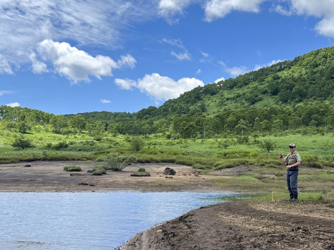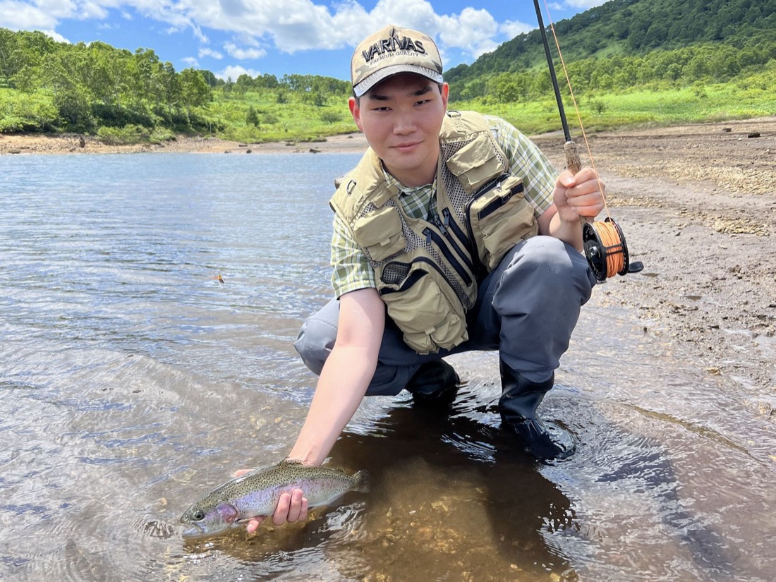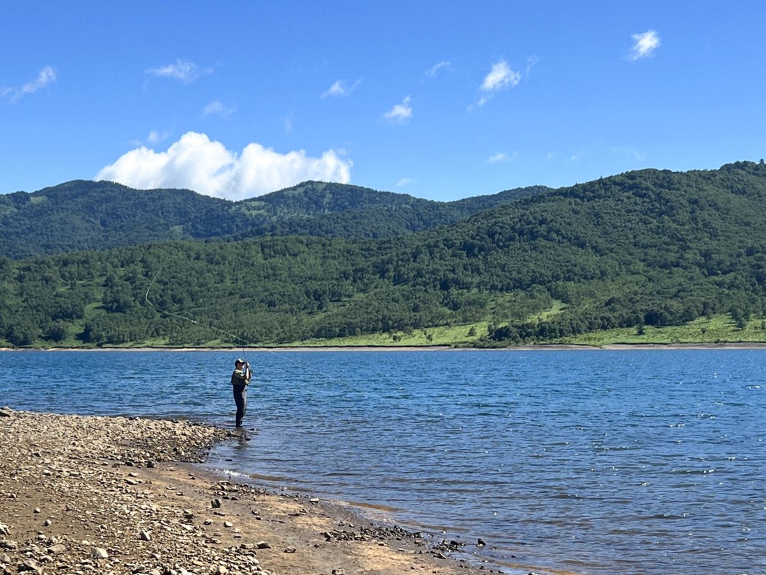 風は弱まり湖面は鏡のように美しく、ここが日本であることを忘れてしまいそうになります。しかしこの状況ではキャストを繰り返すと魚を遠ざけてしまうと考えて、戦略を変えることにしました。長男は静かにアプローチできるシングルハンドロッドVARIVASパワートレイル#6を選択。