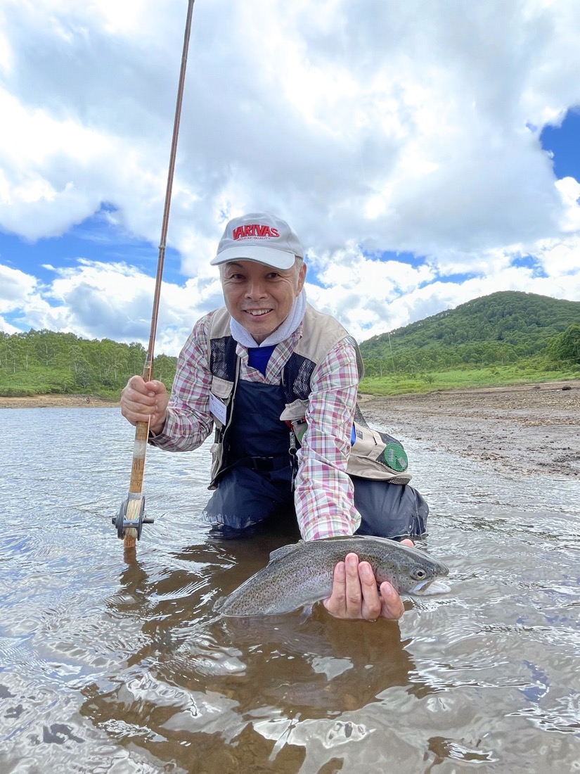 VARIVASティペット ナイロン4Xを1.5メートルと長めに使ってニンフフライを漂わせるドライドロッパー作戦が的中しました。その後私も真似をしてドライドロッパーシステムに変更。レインボートラウトをブドウ虫ニンフでキャッチすることが出来ました。