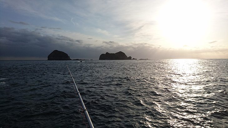 風とウネリを考慮し、釣り座は陸の祇苗島寄りの神津島向きにしました。