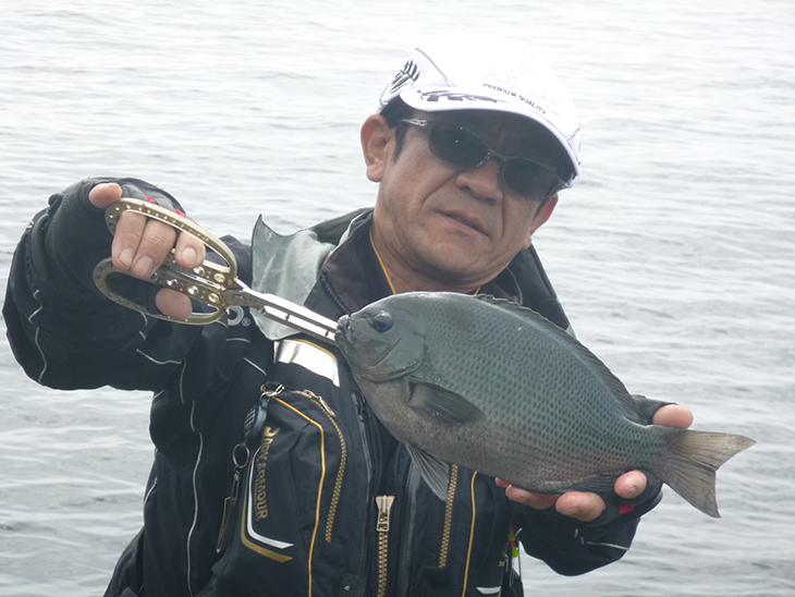 やはり古和浦は平均深棚と言うが間違いない! 棚は竿二本弱だ! 5ヒロから6ヒロの間位だ! ヒントを得た私はゴミを掻いくぐり同じコースを流す努力を重ねた。しかしその辺りから海の様子が明らかに変わりつつあった。時折来ていた大きな波も波長が短くなってきている。それから数投、ヒントは確信に変わる。またもやヒット! 少しサイズアップの口太35センチ笑