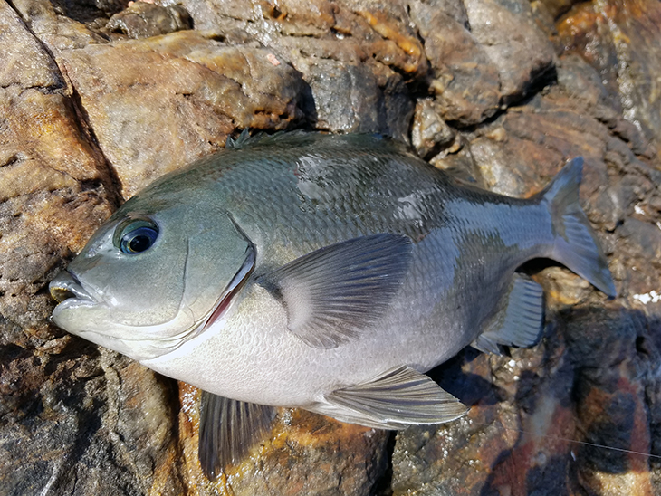 メインのチヌとグレで使い分けました。瀬に上がり海を観察するとけっこうな数のフグとスズメダイが確認できました。瀬際にマキエを撒くと思った以上にエサ取りがいます。はじめは浮いてくるかもしれないグレを狙おうと浅いタナで狙ってみますが反応なし。グレは浮いてきませんでしたがマキエを撒いたことでチヌはある程度寄ってきているだろうと思いチヌにシフトすることに。すると同行者が早々にチヌをヒットさせました。