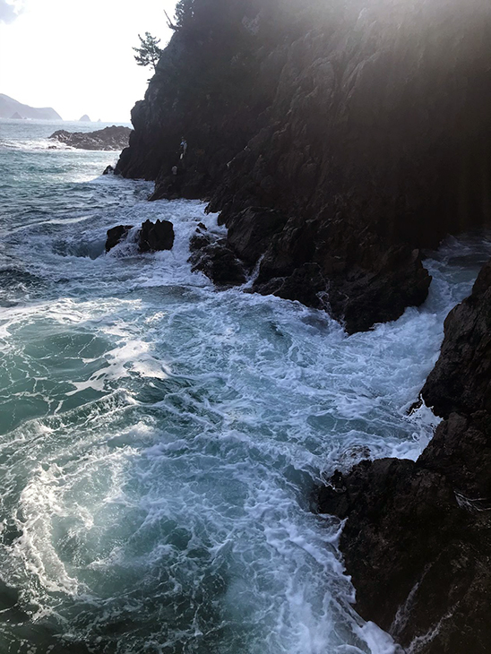 当日は、天気は良いものの波があり、希望した沖磯には行けなかったので、湾内磯での釣りとなりました。湾内磯でも足元はバシャバシャです。
