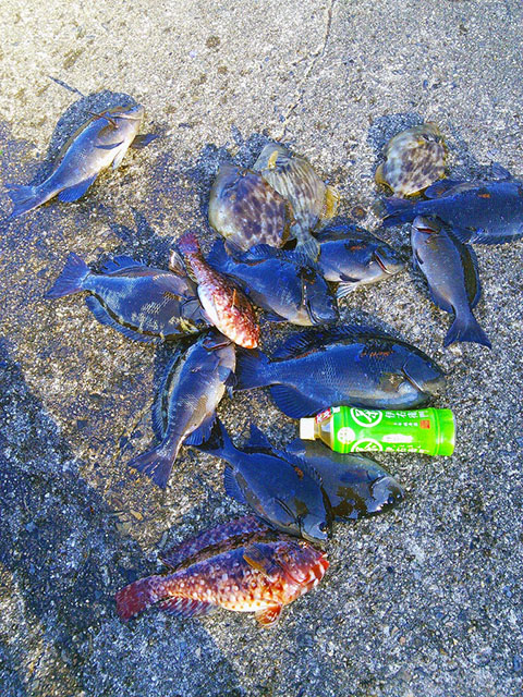 翌日も同じ仕掛けで、比較的低い磯のグンカンに乗ってみたが、朝から掌~足裏サイズの入れ食いモードに。楽しいけれどやや型に不満だったが、潮が左に少し動き始めた頃からサイズアップとなり30~38cmのグレと嬉しい外道のカワハギ3枚と煮付けに最高のブダイのオマケを釣り、この日も充分堪能して今年の釣り納めとした。