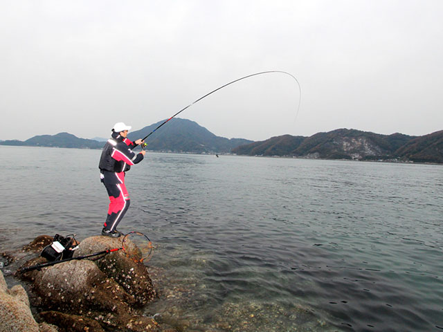 3人で磯にあがり、地形と潮を見るといい雰囲気です。さっそく準備を済ませ釣りを開始。しばらくして33cmのグレや42cmのチヌが釣れ、釣友の原野さんと32cmの良型グレを同時ヒット!