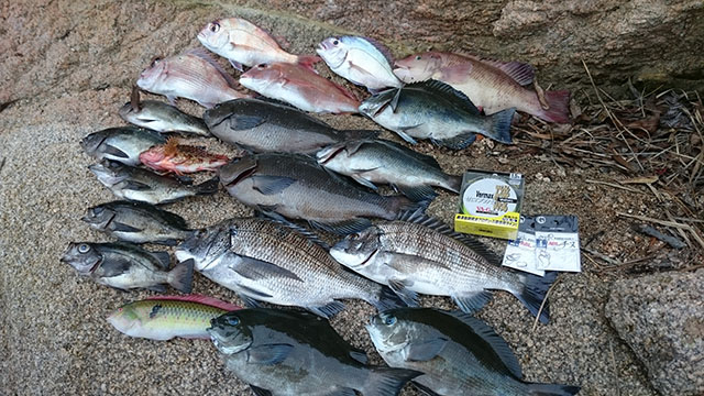 ハリスは1.2号です。高畑さんもバリバスの信者です。このハリスだから取れた! 今回は釣友の高畑さんを祝福です! 自分が釣ったくらい嬉しかったです! その後も33.5cmの良型のグレを追加して終了しました。