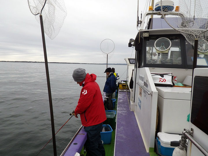 そして翌週の11日は釣友佐藤氏のマゴチ釣りデビューにお付き合いの釣行。この日は北風が強く気温も2月頃の寒い気温で、東京湾でもウネリのため真沖ではアタリが少なく、しばらくすると飯塚船長は大貫沖にポイントを大きく変更。ポイント変更後は船中でバタバタとマゴチが釣れ、マゴチデビューの佐藤氏も48cmを早々に釣り上げニッコリ。ところが私と言えば本命のアタリを3度も早合わせでバラシ、潮の流れが悪いのか全体に食い込みが悪く、アタリのみで離してしまう輩も。時々「コン・コン」と竿を弾くフグのアタリや、「コツン」の後「グイグイ」引き込むシリヤケイカのアタリで翻弄されます。それでもマゴチ釣りの名ポイント大貫沖の本領を発揮し、35~56cmが1~4本でトップ4本が8名。船中15名で48本の大漁でした。私も8打数4安打と打率は下がったものの、魚影の濃さを確認できました。