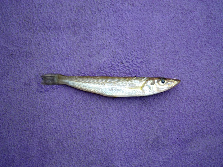 出船は7時、11名の釣り人を乗せた川崎丸は飯塚船長の操船でポイントへ向かいました。ポイントは10分弱の富津南沖。バケツに入っているサイマキの角を1/3~1/2ほど折って、口からハリを入れて角の付け根あたりに出します。ハリ先をチョコンと出すのがポイントです。乗合料金にはエサのサイマキは5尾付いていて、追加のエサは1尾100円で船長から購入します。
