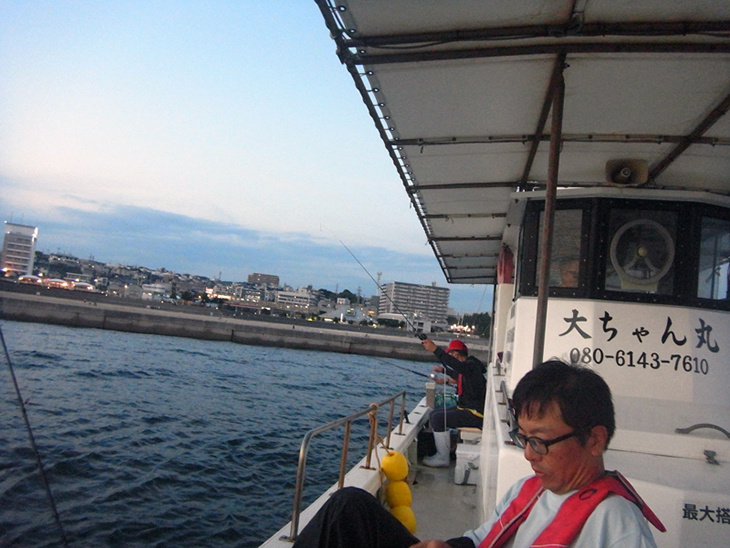 一流しが終わったころに暗くなって、船に明かりが灯った。陸地のマンションや商業施設の明かりも海面を照らし、さらにイカには不向きといわれてる満月状態。でも、こちらではこれが通常で、例年の釣果は1人30~50匹くらい。しかし、ここ数日は濁りが出て低調。この日もかなりの濁り。