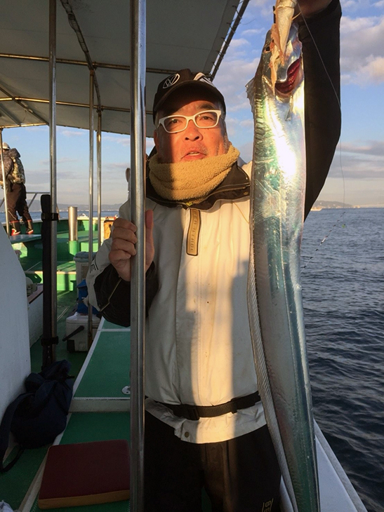 船が潮上りをして、同じ筋を流す。アタリ棚は50m前後。しかし明確なコンッとかゴツンッとかの激しいアタリは出ない。竿先をわずかに震わせるような、フンッと押さえるような途中で消えてしまうような小さなアタリばかり。でも、アタリは結構ある。タチウオの反応が出る限り出たアタリは即合せ。ビシバシ合わせる。けれどサイズが出ない。中盤までで指3~4本サイズを12~13匹くらい。ようやく強く引き合いを楽しめるメーター超えが上がったのはやや深い65mライン。