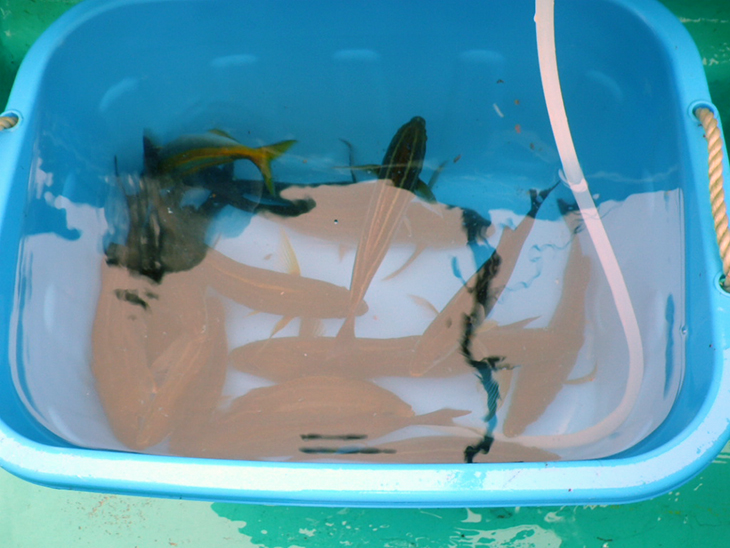 イサキのポイントもこの背に数十ヶ所。船長の向かったのは航程10分。反応を見て「海面から11m」との指示で投入合図。コマセカゴにアミコマセをタップリと入れ、ハリには付けエサのバイオワームをチョン掛けにします。ハリスは1.5号をチョイス。コマセカゴの調整は、上部は1/3~1/2開けて、下部は海水が出る1mm程度開けます。コマセシャクリ釣りの場合は、コマセを1度に大量に出すのではなくポロポロと撒いて付けエサの付いているハリを食わせます。コマセを一度に撒くとイサキは早く満腹になって食いが落ちてしまいます。