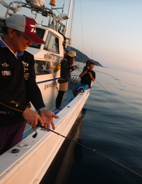 お次は8月4日、釣りビジョンのロケで何度かご一緒した中条友莉ちゃんを囲んで、同窓会と銘うって越前茱萸崎港の米翔丸を釣り仲間10人で貸し切り夜遊びをしてきました。ポイントは茱崎港からスロースピードで10分と近く、水深40mジャストにアンカーを降ろした掛かり釣りでスタート。タックルは前述と全く同じです。