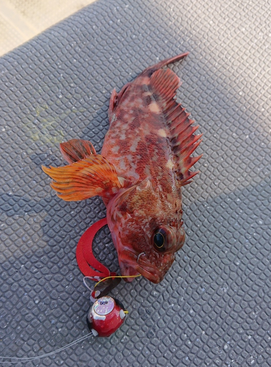 底から10mほどでぴょんぴょんぴょんと、初の反応。竿先を軽く弾きながらチャリコが上がってきたがリリース。次もプルプルと小さなバイト。でも、反応があるので、しばらくイカタコで巻き巻き。