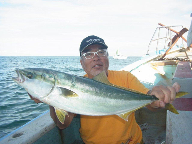 船が伊勢湾口方面に転進。少し深くなって水深が80m。イワシを掛けて、ここでも底狙い。途端に竿先がグイグイと強く引き込まれ、いったん送り込んで強く合わせる。がむしゃらに締めこむ引きは青物。船の下に潜り込んだのを強引に引き寄せ、66cmのメジロ(ワラサ)。
