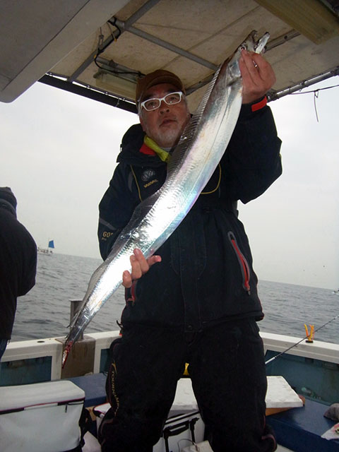初釣りは大阪湾タチウオ、「湾タチ」です。笑顔笑顔で今年もよろしくのご挨拶。そして、午前6時に河岸払い。洲本沖で1投目。水深が80m。底から15mでコツンと反応。即合わせで、90センチクラス。新年1投目、初アタリをアワセて、幸先よ~し、です。