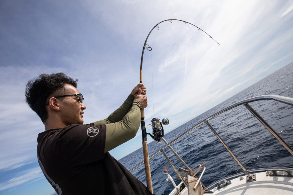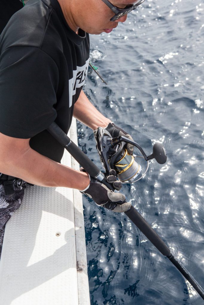後輩であり、チャレンジャーという立ち位置ではあったが、中村さんの1本で松成さんにも火が付いたのは間違いない。オフショアのキハダキャスティングは初めてでも、ショアでは数々の大型魚を仕留めている手練れだけに、しっかりと短いチャンスタイムを活かし、見事に掛けた。
