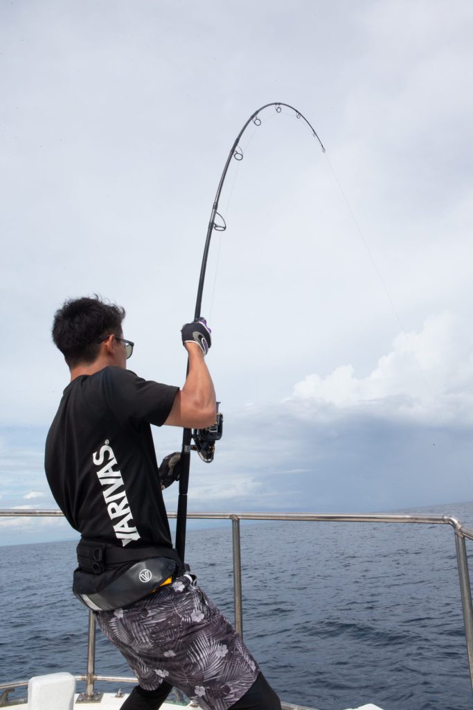 PE6号タックルをしっかり曲げ込んでキハダにプレッシャーを掛ける松成さん。