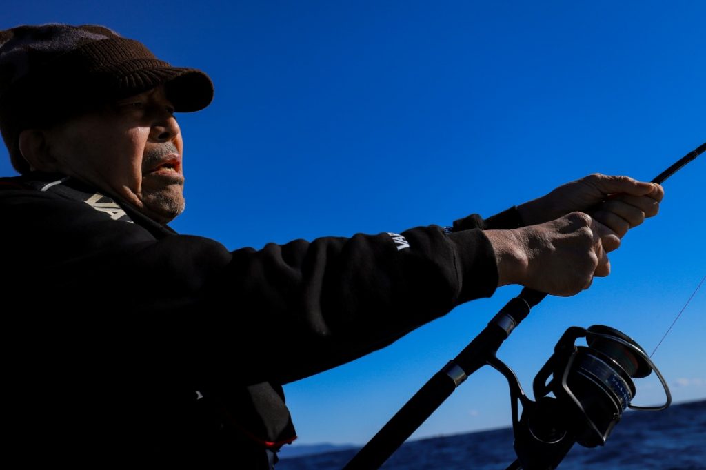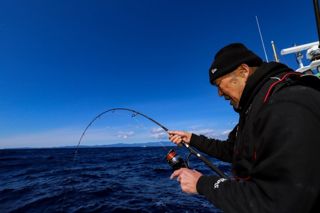 その一投目だった。90mラインを意識して、その周辺を集中的に探っていた北村に、強烈なアタリ。いきなりもの凄い勢いでラインを出され、魚は沖へ沖へと向かっていく。それに合わせて北村は船の中を移動し、船長も船を操作する。