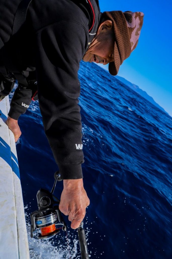 ▲「デケェぞ!」北村が叫んだ。もの凄いスピードでラインが出ていき、まったく止まる気配がない。その後方では、北村の様子を見てジグを回収していたスタッフの斎藤にヒット。ダブルヒットだ。