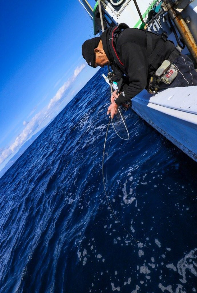 船の流し方は、三重沖ではドテラ流しが主流であるが、ここ伊豆沖はスパンカーを立てて行う縦釣りがメイン。それゆえ、伊豆沖では使用するジグも比較的軽めで、ラインスラックもドテラ流しのようには出にくいので、ジグの位置もイメージしやすい。