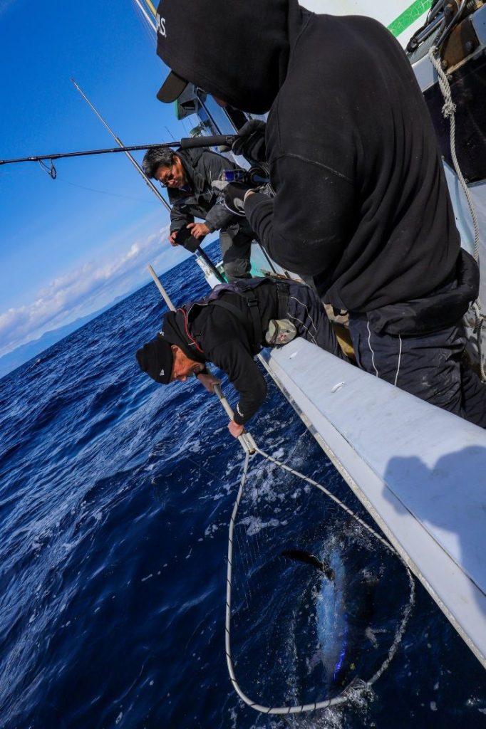 もちろん、ロッドもリールもPEラインもリーダーも、そしてノットもすべてその性能を知り尽くし、信頼し切っているものばかり。だからこそ、安心してファイトを行うことができる。北村はスルスルと魚を寄せ、青白い魚体が円を描くのも見えた。ビンチョウだ。