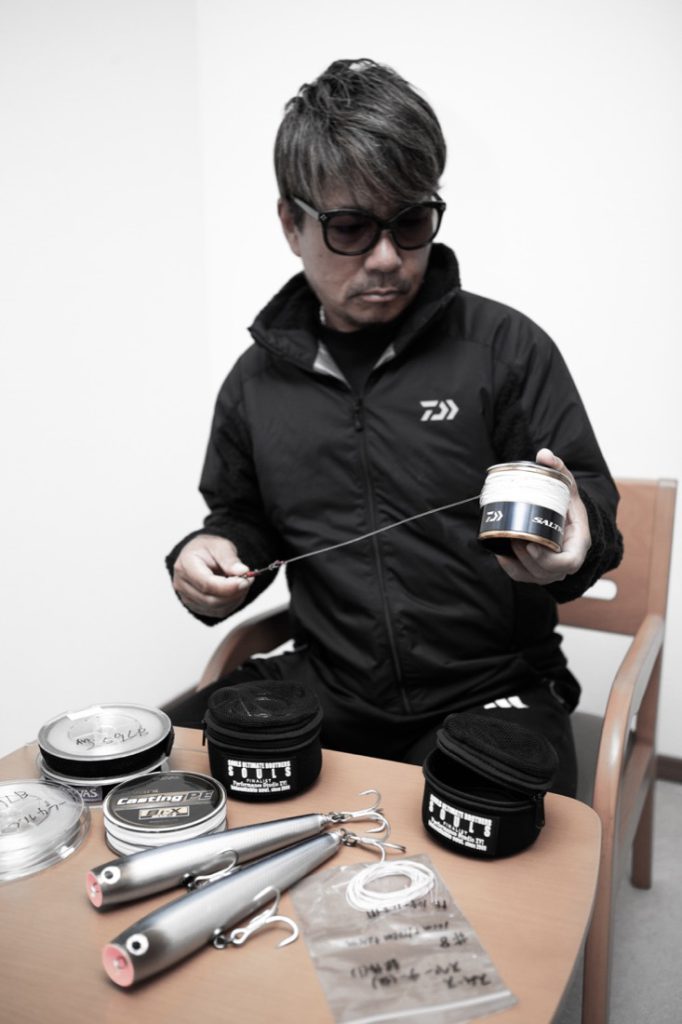 ▲プロトモデルを含め、6~7年前から自身のラインシステムに組み込んでいるというアルティメットファイティングリーダー。引っ張りに対する強度だけでなく、飲み込まれたときの擦れにまで対応可能。万全に万全を期すためのアイテムだ。