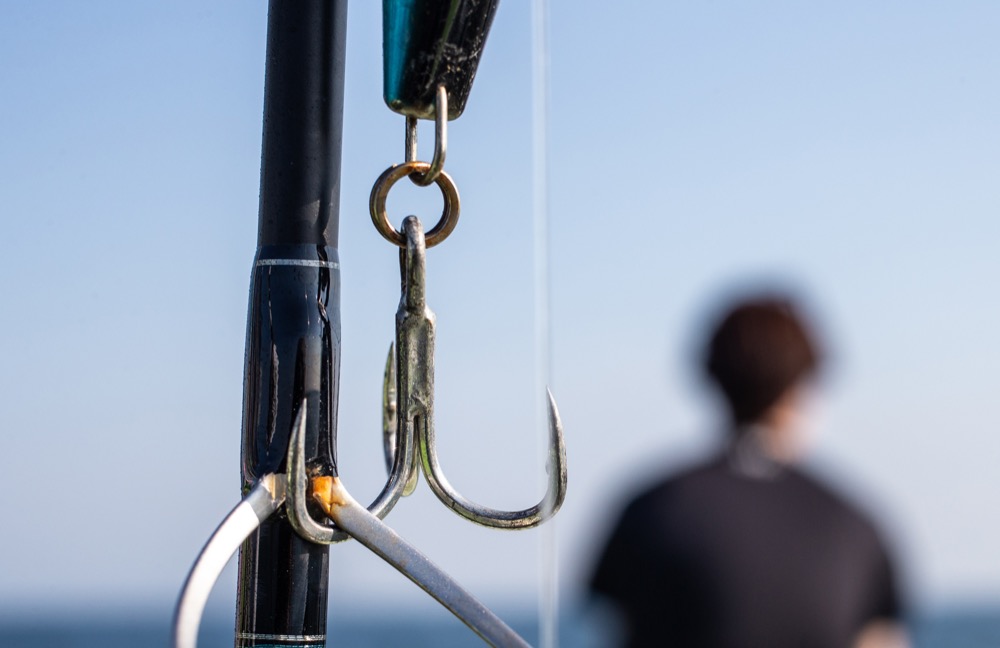 ▲庄治郎丸ではバーブレスフックをレギュレーションとしている。そのほか、ライフジャケットは当然として、キャップやハット、足の指を露出しないシューズ、偏光グラス(シイラを見つけるためにも必須)など、自分を守るための装備も万全にしておきたい。