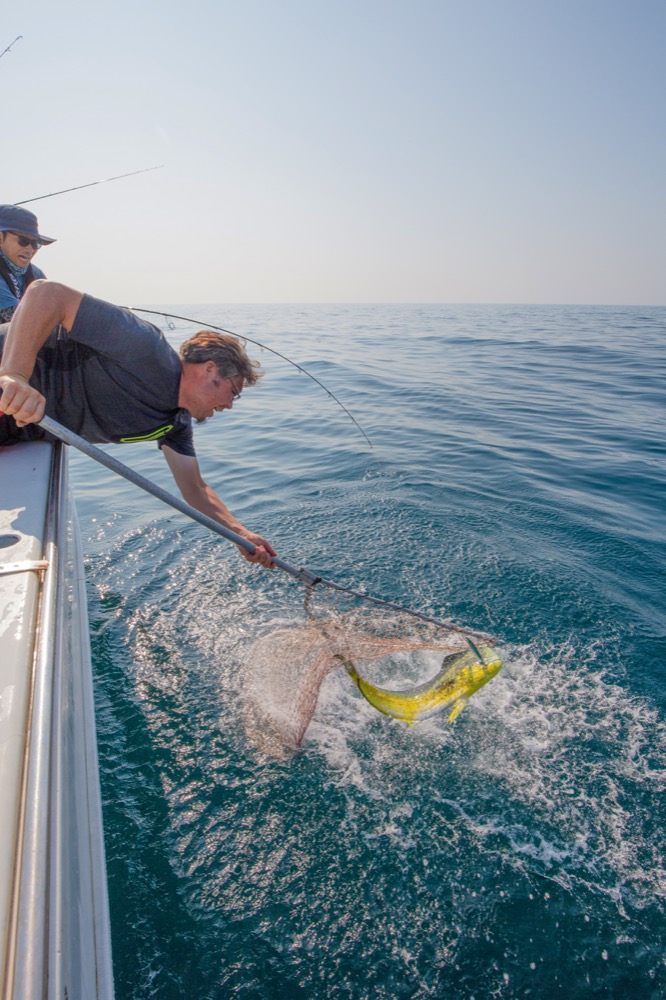 シイラの動きの先手を取ってコントロールして、船底に触れないようにするのが基本。