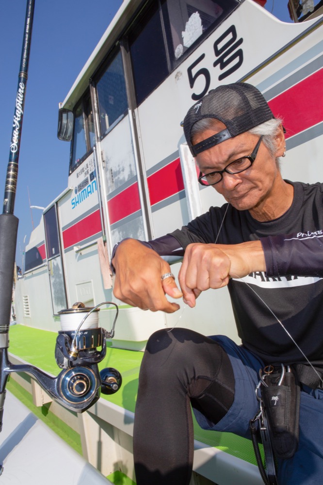 ▲ラインシステムを組み直すときは10mほどPEラインをカットする、という石井さん。細いラインでビッグフィッシュを楽しむための税金みたいなものだ!?