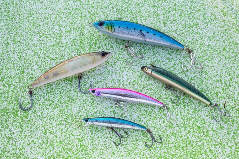 ▲石井さんの厳選シイラ用ルアー。写真上の2つがグランバイツ ラッシュダイブ140、写真右がハンドメイドのジャークベイト、下2つはギグギガントフック120S、ギグギガントフック レベルフォール100LF。