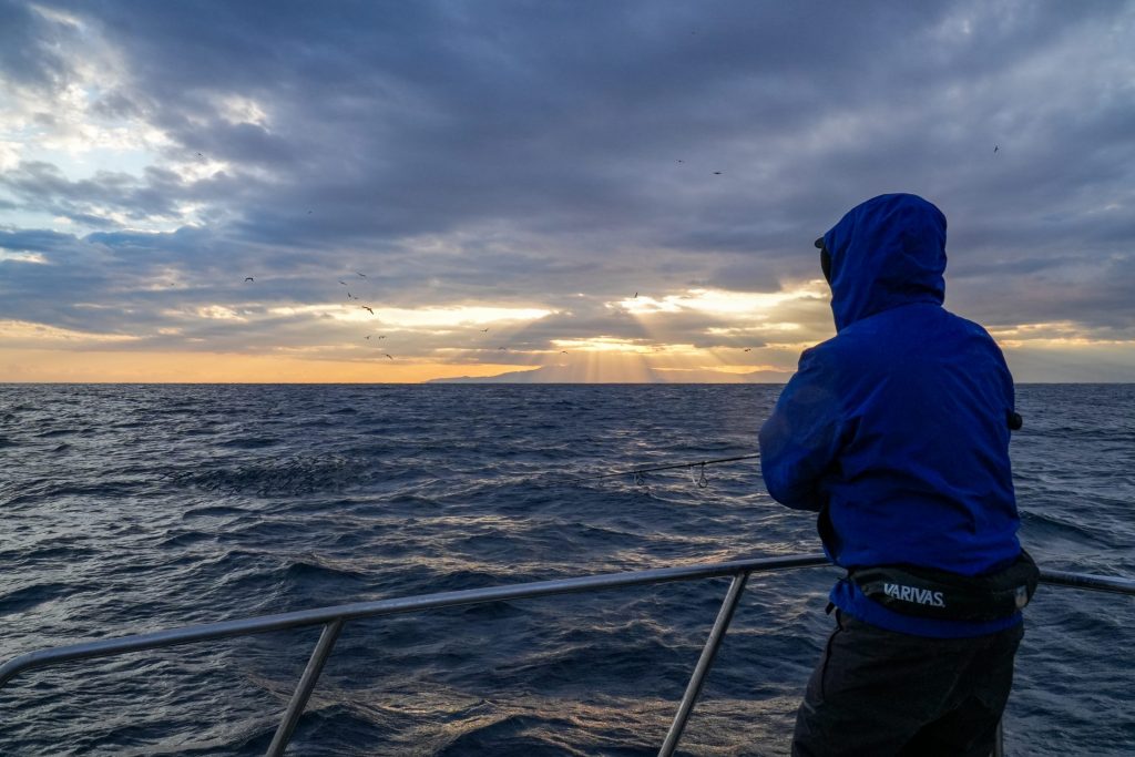 相模湾内に入ってもなお船は西へと走り続け、ようやくそれらしき鳥を見つけたのが15時半。太陽はすっかり傾き、水平線付近はオレンジ色に染まりかけていた。納竿の時間を考えれば、このタイミングが最後のチャンスだろう。