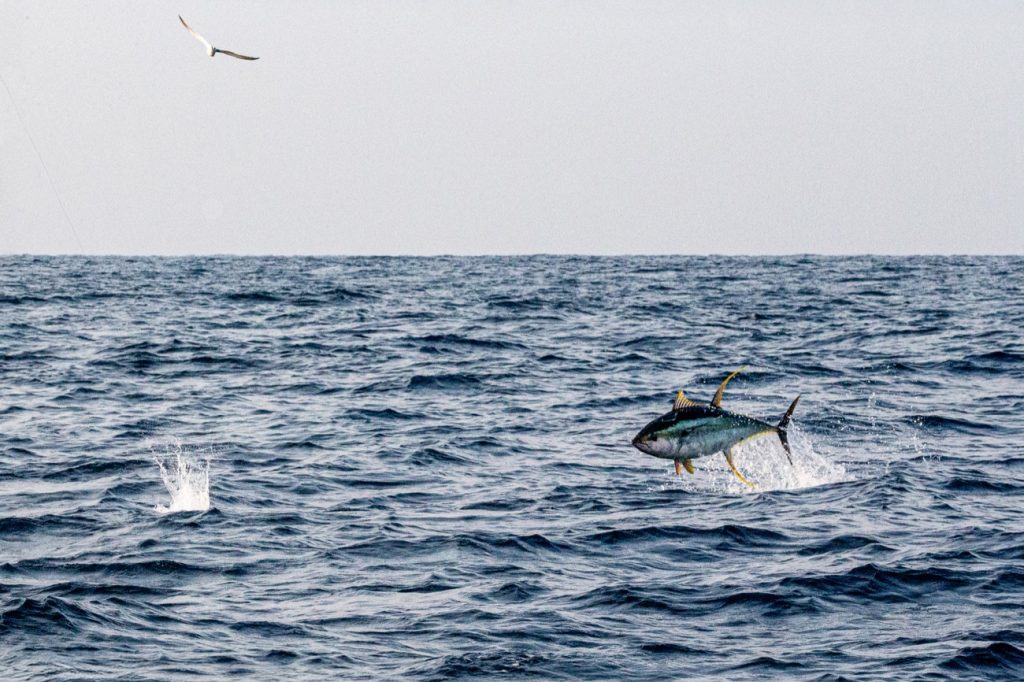 ▲キハダが跳ねる! トリの真下、ベストと思われるスポットに着水したルアーにヒット!? ナブラ撃ちのキャスティングゲームは非常にエキサイティングだ。