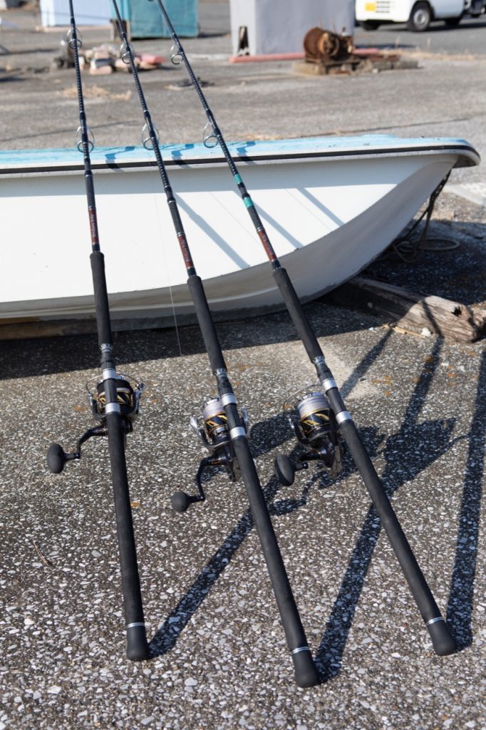 ▲池上さんが船上に持参したタックルは3セット。キャスト性能を重視したPE6号、8号タックルで組み立てた。