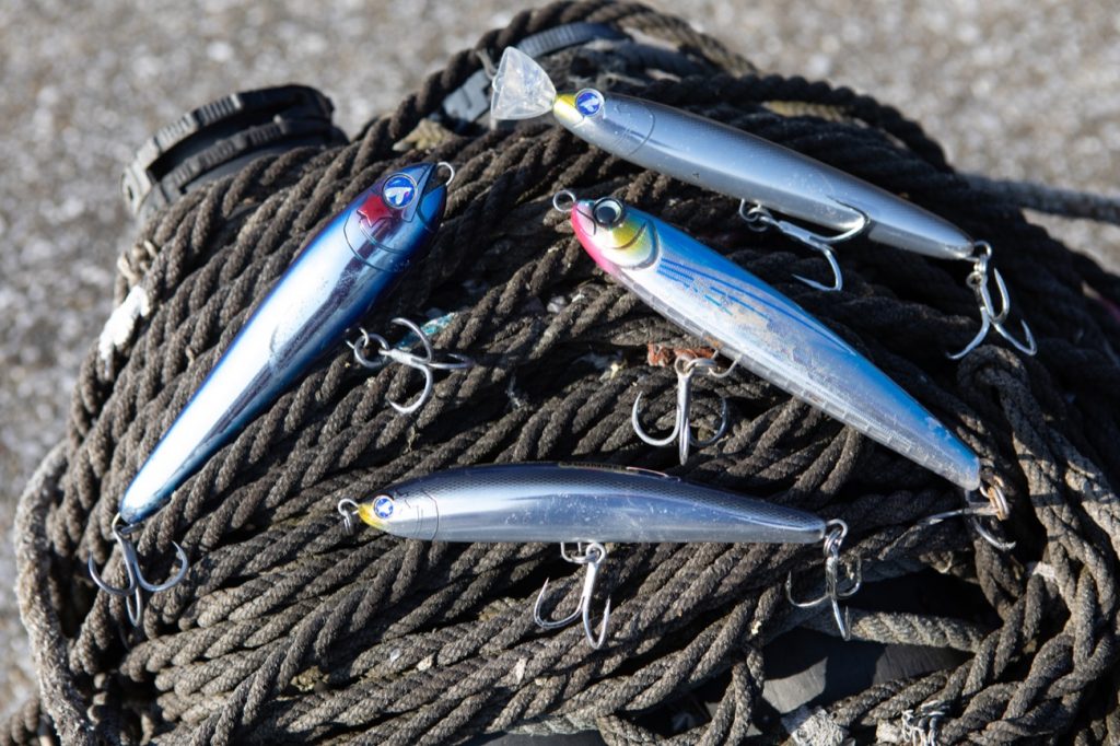 ▲今回、池上さんが使用したルアー。ガチペン200、ガチペンスイマー180、ガチポップ トゥリーパ180(すべてブルーブルー)。プラウラ―190(ジャクソン)。
