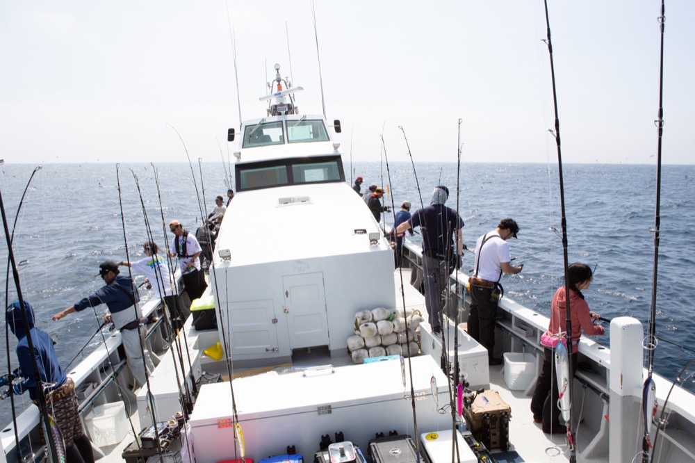 ▲大型船の両舷に乗船して楽しむのが外房スタイル。ドテラ流しを基本に片舷でジギング、反対側でキャスティングを行うことが多い。