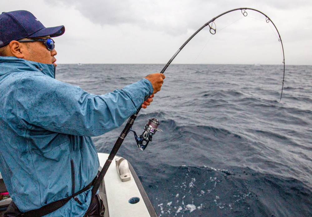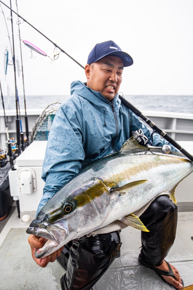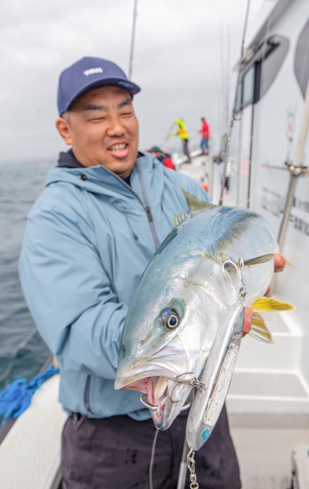 これはヤバい? そんな雰囲気に包まれた船上で最初にロッドを曲げたのはキャスティングを繰り返していた椙尾さんだった。小型ではあったが上がってきたのは待望のヒラマサ。船中を活気づけるには十分な1本だった。