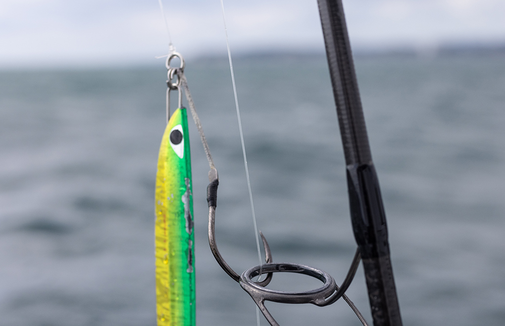 とくに秋冬のデカいヒラマサがヒットする場合はだいたい一撃。ドカンッと食ってきます。折れたり、伸ばされたりしないように、春に比べてひと回り太軸のフックにすると安心できますね。