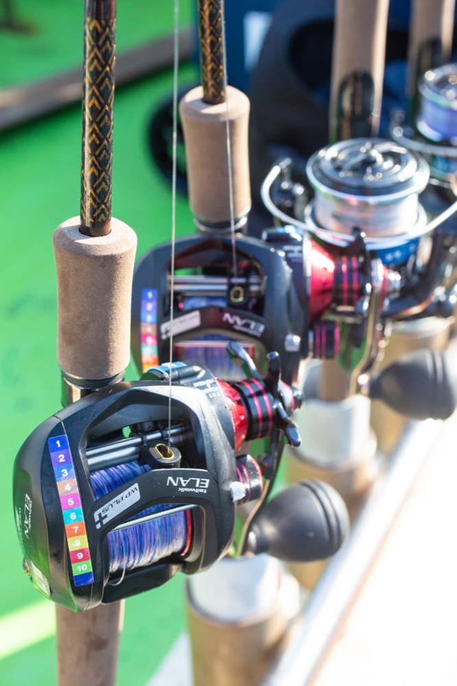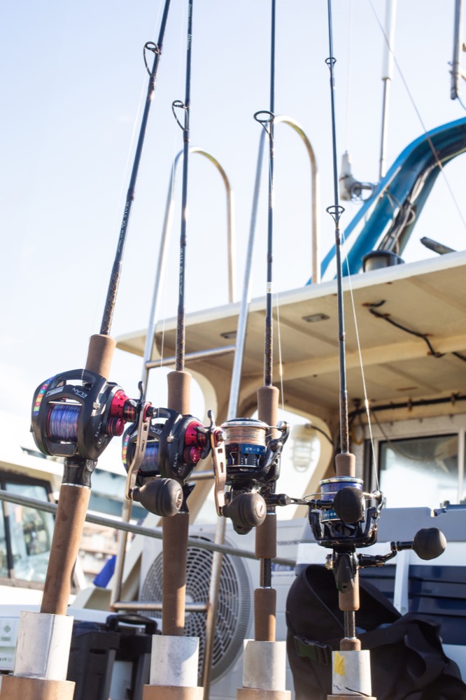 ▲ジギング用には0.8号と1号のベイトタックルを用意。シャローエリアを釣る可能性あり、というときはスピニングタックルも準備する。