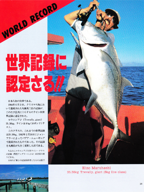1984年6月、丸橋は、オーストラリアのクリスマス島で、アジ類の最大種で、英名のGiant Trevallyの頭文字から“GT”と呼ばれる「ロウニンアジ」とのビッグゲームを制した。ラインは、VARIVASの16ポンド(4号)。サイズは驚異の78ポンド(35.4キロ)。ラインのマックスポンドの実に5倍という巨体を釣り上げ、丸橋は、「日本人初のIGFA世界記録」という栄誉を手にしたのだ。