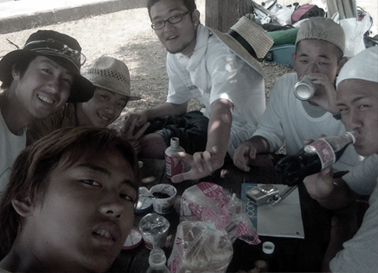 最初の訪問国はタイ。自身初めての海外旅行だ。小塚は自らを「ビビリ」というが、じつは意外に慎重派だ。この時も「海外の僻地で手持ちの金を奪われた」場面を想定し、事前に国内の無人島で対策合宿を試みている。「今思えば意味不明でしたが、空腹だったりに対する肉体の限界を知っておきたかったんでしょう。大学のクラスメイトたちを誘って牡鹿半島の無人島へ。……結果的にウニの密猟疑惑をかけられ、有人島のキャンプ場に強制移動させられるんですが(写真:小塚は右端)。他のキャンプ客から「余ったんで」ともらった食料に、がっつきましたねー(苦笑)。その後、25kgの荷物を背負い、1日何キロ歩けるかやってみた。結果、僕は1日55km歩ける。ということは、飛行機が出る6日前までに空港から300km圏内にいれば、金がなくても帰国できる」。