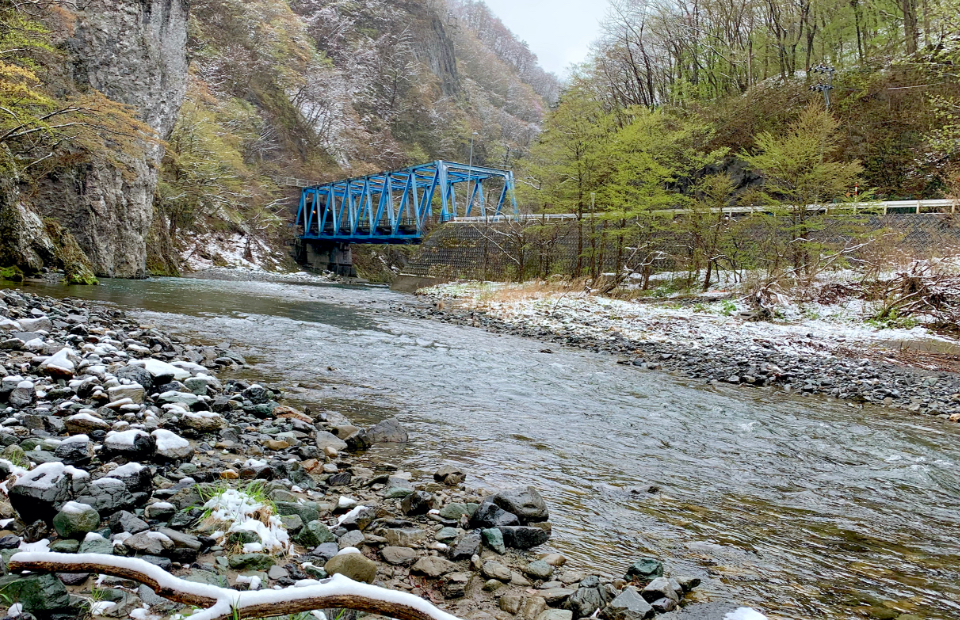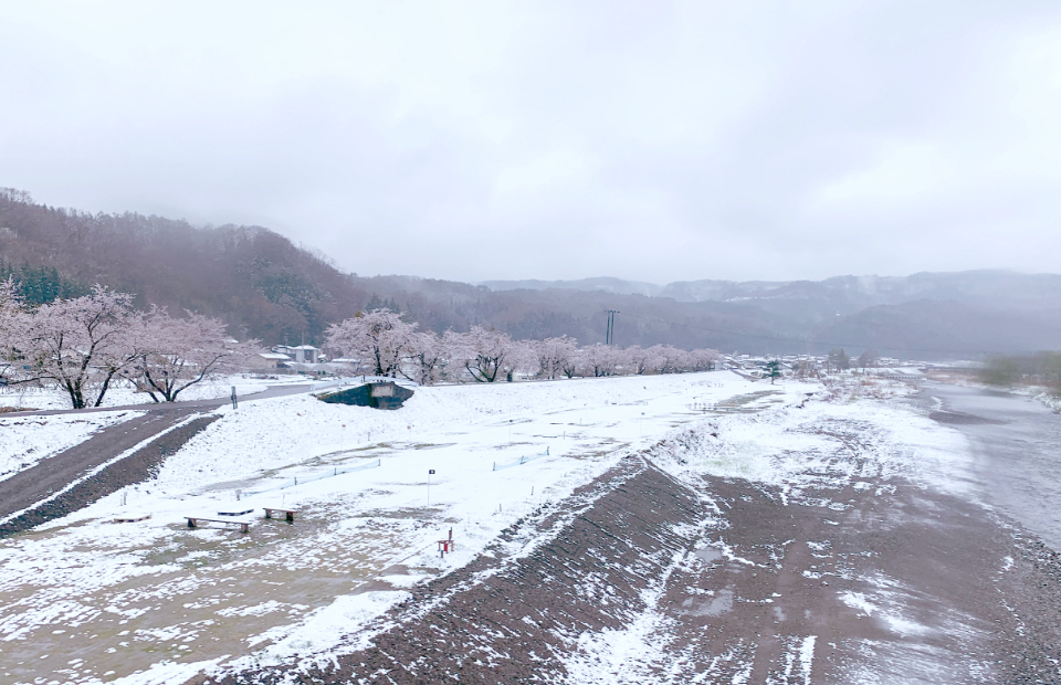 ▲国道281号線沿いを流れる久慈川の岸にも時季外れの雪が積もった