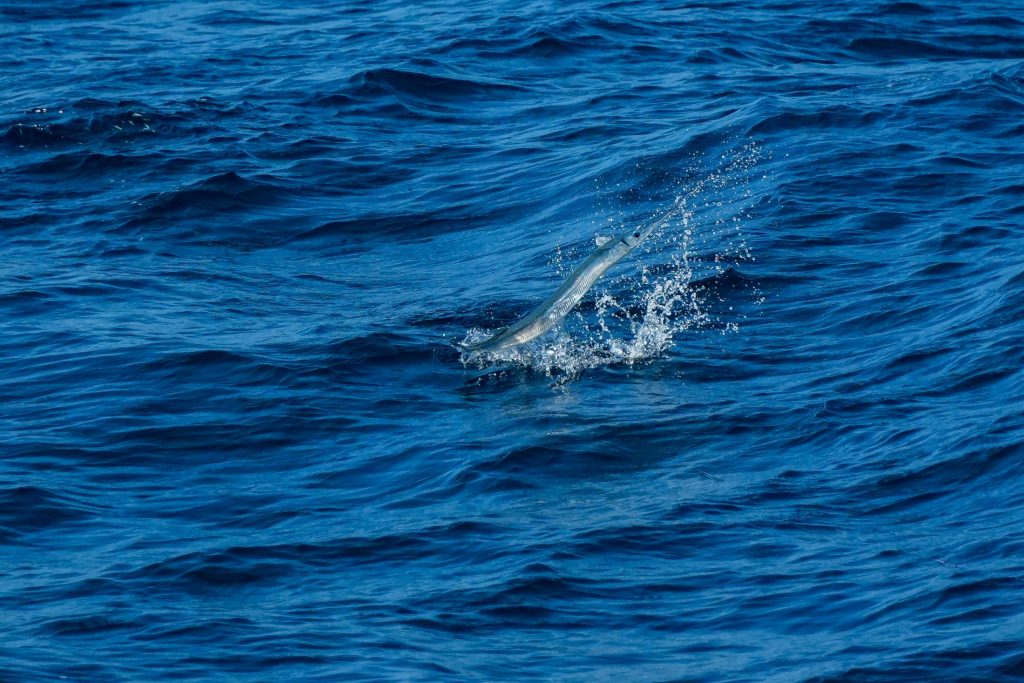 その後、タチウオが何かに追われて跳ねるシーンにも遭遇。期待は高まる一方だったが、田代のルアーをダツ以外の魚が襲うことはなかった。