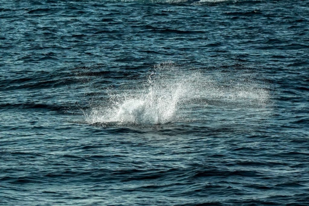 大きく状況が動いたのは午前7時半だった。ダツが何かに追われて捕食されたのだ。遠くの潮目のような海面変化がある場所では、しきりにダツが捕食されているようで、何度もド派手な水柱が上がっている。